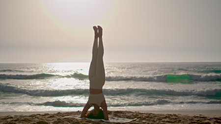 African american woman doing headstand yoga pose on seashore at sunrise. Athletic girl standing on head training body balance outdoors. Strong sportswoman practicing asana on Ursa beach summer evening
