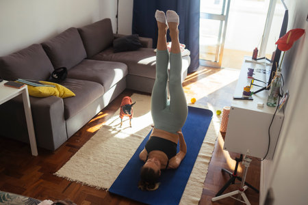 sporty woman practicing yoga, doing headstand exercise, salamba sirsasana pose, working out, wearing sportswear black, watching fitness video tutorial online on laptop, doing workout at home sitting.