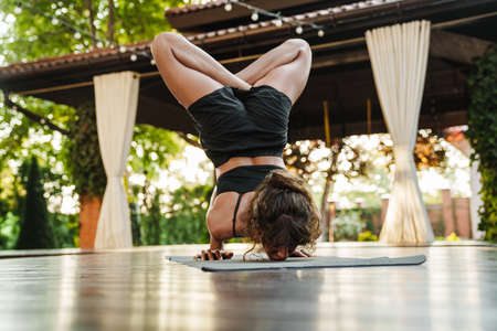 Slim athletic young woman practicing yoga asana, headstand. Rear view of a girl standing on her head on a yoga mat outdoors. Healthy active lifestyle. Vertical image.