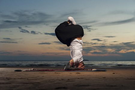 Yoga by man in black trousers on the beach near the ocean in India