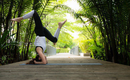 Asian woman practicing yoga in Supported Headstand Pose on the mat in outdoor park.