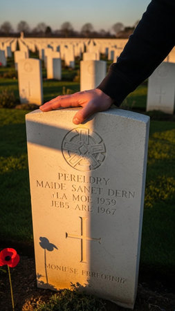 Tombstone Adorned with Red Flowers at Sunset, Evoking Themes of Remembrance and Loss.