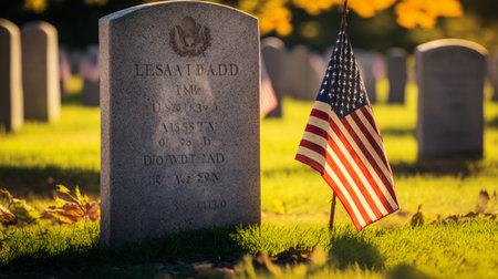 A folded American flag rests against a headstone in a military cemetery, symbolizing honor and remembrance for fallen soldiers. The scene evokes a sense of solemnity and respect.