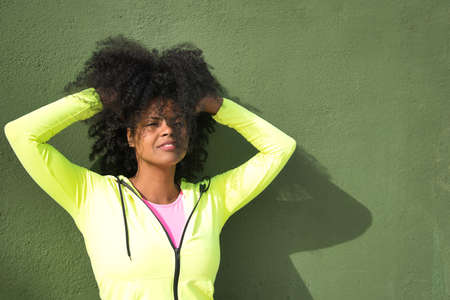 A radiant Black woman with a beautiful afro hairstyle smiles joyfully outdoors. She is wearing athletic clothing and a fitness tracker, embodying a healthy and active lifestyle.