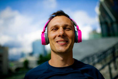 Close up portrait of good-looking sport guy spending time outdoors and expressing positive emotions