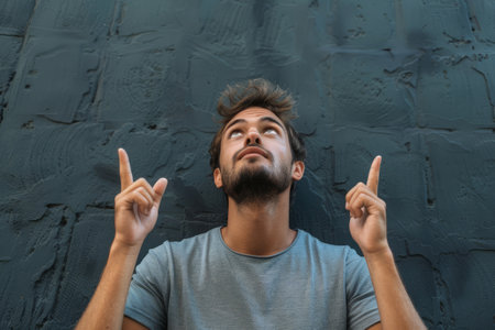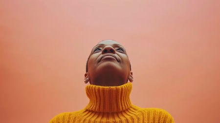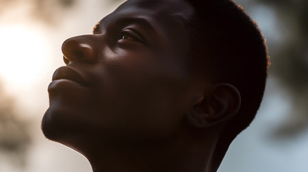A hopeful African American man gazes upward, embodying inspiration and confidence. This portrait captures emotions of positivity, serenity, and determination.