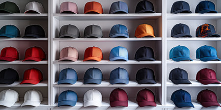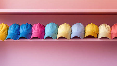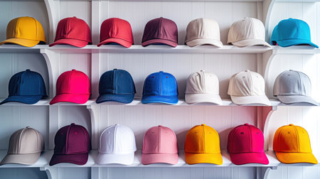 Colorful baseball caps lined up neatly on a shelf in a minimalist retail space