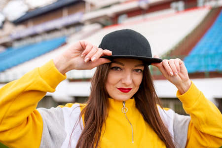 Girl in a cap at an empty stadium