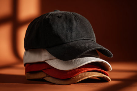 Stack of cotton baseball caps with curved visors placed in sunlight