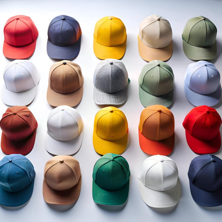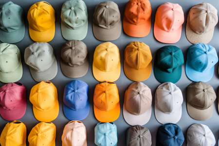 Overhead view of neatly arranged baseball hats in various colors representing minimalist fashion retail