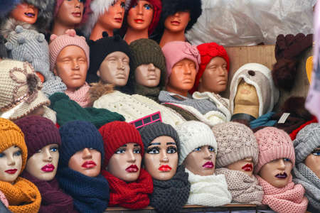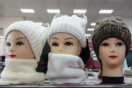 Heads of female mannequins in knitted winter hats and scarves