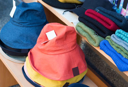 Colorful baseball caps on white shelves in the store, close up