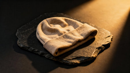 Cozy tan wool winter cap resting upon rugged black shale, emphasizing material textures and stark contrast under a shaft of golden directional lighting.