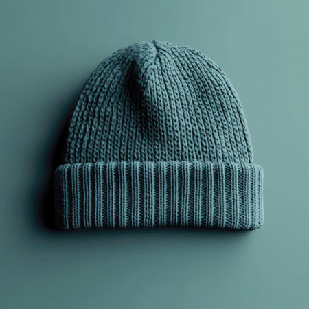 Photo of a beanie hat mockup on a plain background, captured in a close-up shot with soft shadows, showcasing a modern and minimalist vibe