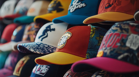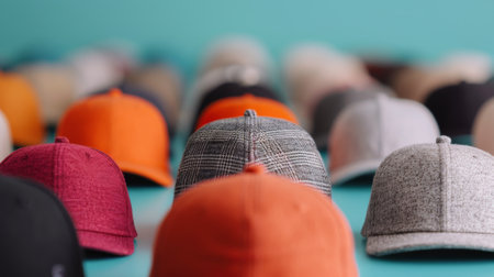 A vibrant and diverse collection of 20 colorful baseball caps. showcasing a mix of textures and styles. Perfect for fashion blogs. online stores. and social media content.
