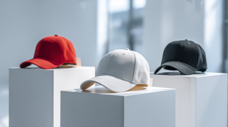 Baseball cap collection in red, white, and black colors displayed on white pedestals in bright modern setting with soft natural light