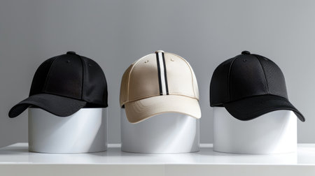 A striking image showcasing a collection of modern caps arranged on sleek, minimalist stands. The contrasting colors and stylish design highlight contemporary fashion trends.