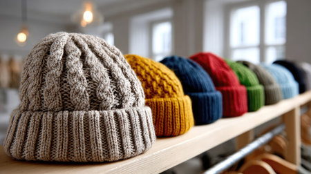 A collection of colorful knitted hats beautifully arranged on a wooden shelf in a modern shop setting, showcasing their unique textures and styles.