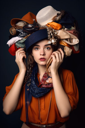 shot of a young woman holding up accessories to show a pile of clothes