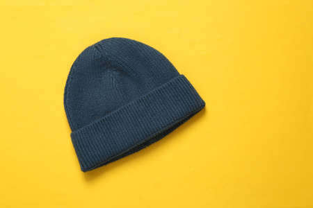 Beanie hat on yellow background. top view