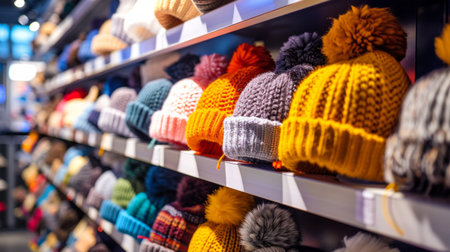 Cozy Winter Hats Displayed in a clothing Store. Concept of fashion accessories, warm clothing, shopping for winter, and colorful knitwear. Copy space.