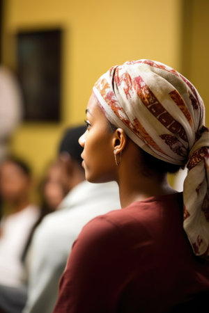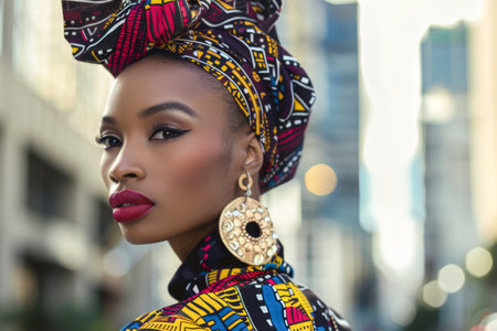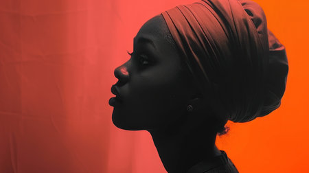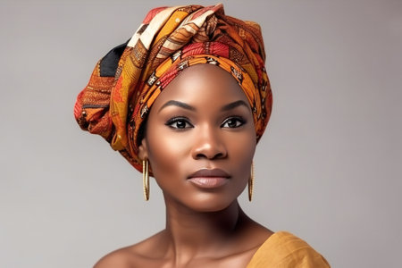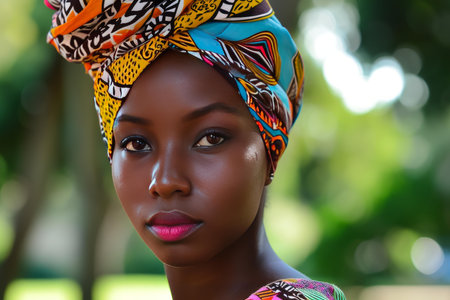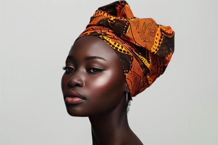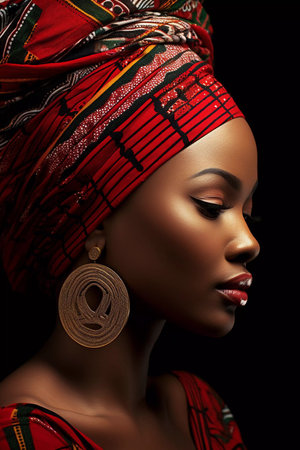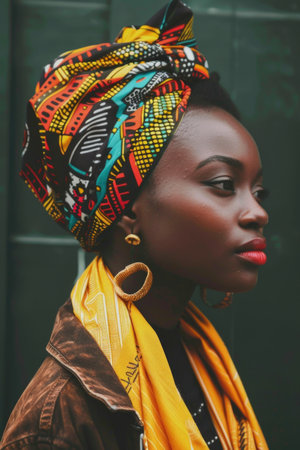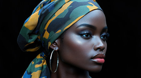 Striking profile shot of an african woman with colorful headscarf and makeup