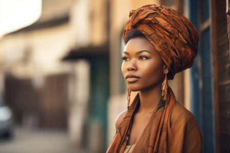 A young woman stands gracefully in a sunny urban area showing her brightly colored headwrap and elegant jewelry. Her serene expression reflects cultural pride and beauty.