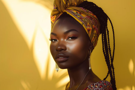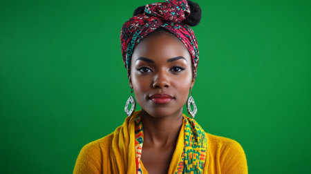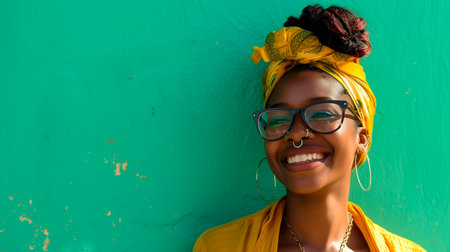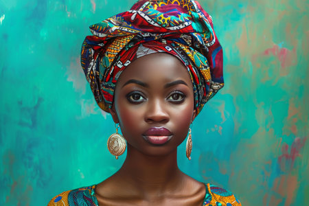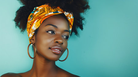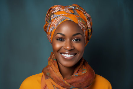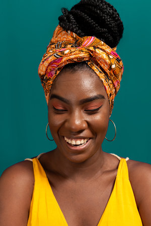 Portrait of young beautiful African woman wearing yellow turban. Teal background with copy space.