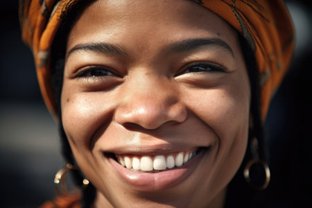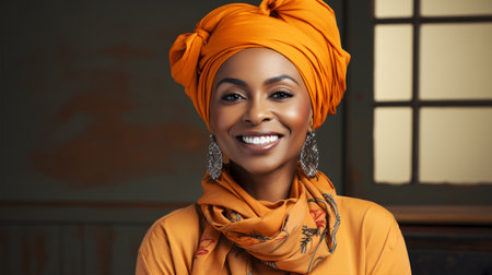 Woman with bright orange head scarf and large hoop earrings smiles at the camera. Generative AI.