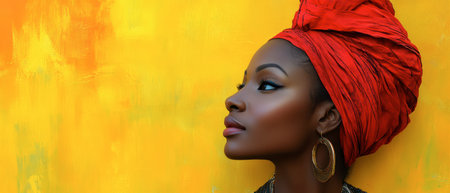 A graceful woman with a red headwrap poses, showcasing her profile in front of a vibrant yellow wall, highlighting her beauty and confidence.