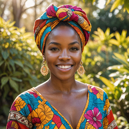 Smiling African American Woman in Colorful Traditional Outfit in Sunlit Garden