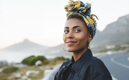 A young Black woman with dreadlocks and a colorful headwrap smiles as she looks off to the side. She is wearing large hoop earrings and a dark denim jacket. The background is blurred, showing a coastal road and mountains.
