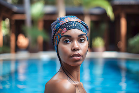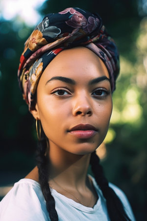 Close-up of a serene woman with sun-kissed skin donning a vibrant headscarf