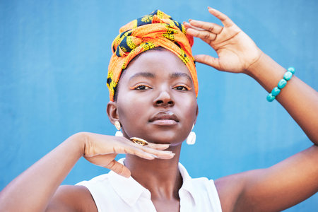 Fashion, Africa and portrait of black woman on blue background with natural beauty, glowing skin and makeup. Hands frame face of girl with African style or design cosmetics, head scarf and jewellery