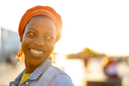 Happy Muslim African woman wearing turban smiling in camera on the beach during summer vacation