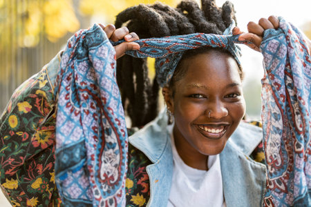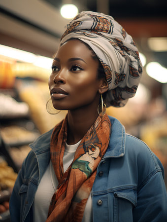 Fashionable african american woman wearing headscarf and jeans jacket.