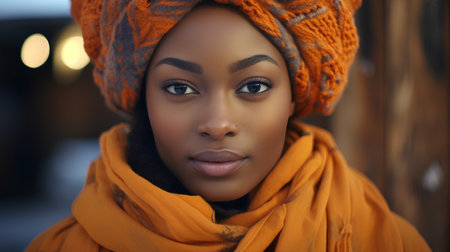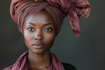 A woman poses confidently with a stylish headscarf, showing her captivating beauty.