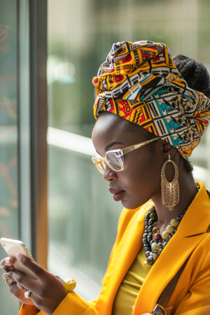 beautiful african american woman in yellow jacket and headscarf using smartphone