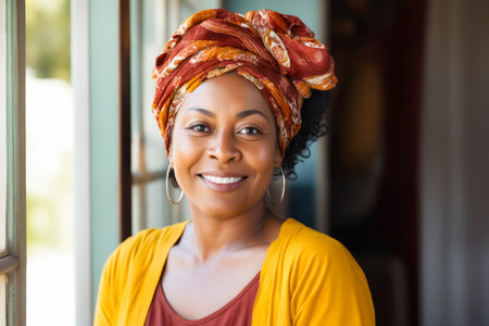 A woman with a bright yellow headwrap and large earrings smiles warmly in a cozy living area. Natural light highlights her joyful expression and colorful atmosphere.