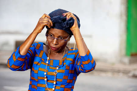 beautiful adult businesswoman standing on the street and knotting a scarf on her head.