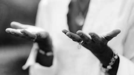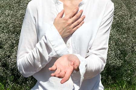 Practicing Virtue of Giving. Hand gesture. Female palms raised upward, dressed in white outdoor