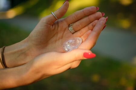 Female hand with transparent amethyst quartz yoni egg for vumfit, imbuilding or meditation. Shining crystal egg in hands on sky and sunrise background outdoors. Womens health concept.