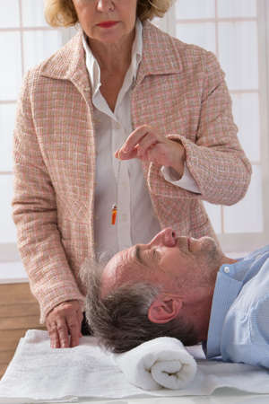 Therapist man doing Holistic therapy Reiki to a woman. Energy treatment with the heat of the palm hands. Japanese energy healing. Wellness, health, relaxation, well-being and alternative medicine concept.