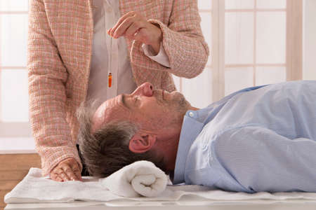 Reiki practitioner healing throat chakra, woman lying with her eyes closed. Alternative therapy concept.