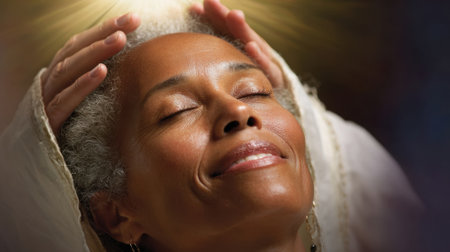 Concept photo of a faith healer with a radiant smile, laying hands on a womans head as she closes her eyes and receives the healing power of prayer