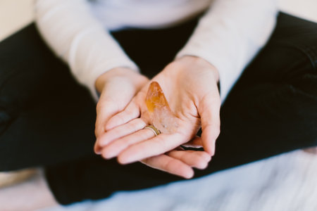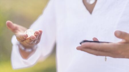 Female crystal healing therapist meditating, manifesting abundance with white selenite crystal. Energy work