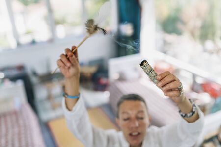 Smudging or Space Cleansing – Spiritual woman holding burning sage, cleansing space from negative energy.