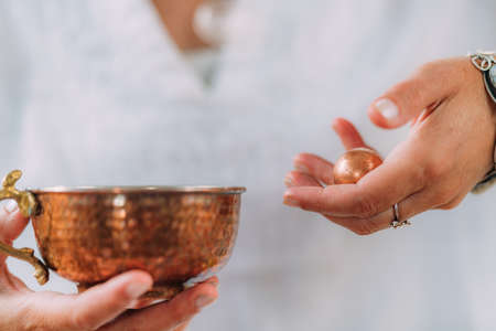 Close up of female mentor and student before Mindful meditation and yoga in the gazebo. Facilitating meditative experience. Part of the series. Tibetan singing bowl. Soft focus, blurred, noise effect