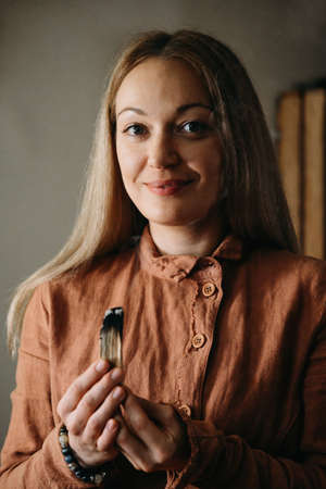Woman meditating with palo santo in studio, cleaning space with smoke. Adult person using burning spiritual incenses at home