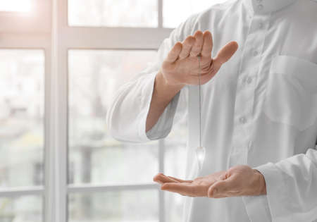 holding and using quartz crystal pendulum and using it In asking questions. Quartz Crystal Pendulum Hanging over a Hand
